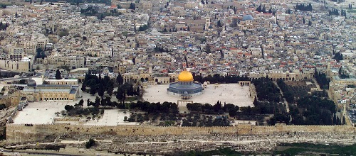 Notice here that the Dome on the Rock is not in line with the eastern gate. This picture is taken from the east side. You can see the east gate on the lower right, on the east wall. There is room north of the Dome to place the temple inside the East Gate. It would seem that the temple has to be near the East Gate of the court for Jesus to enter from there.